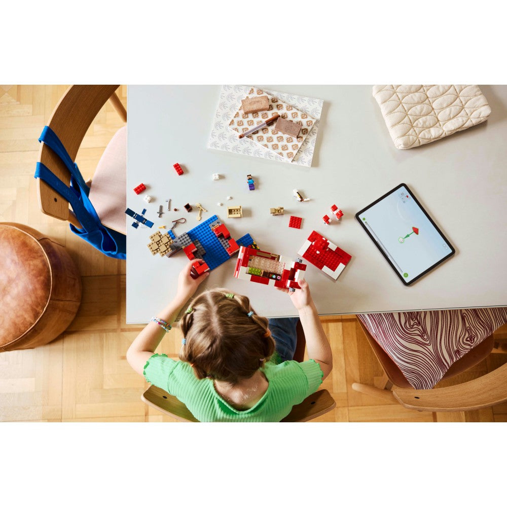 „LEGO® Minecraft®“ žaislinis grybakarvių namas (21270) puikiai tinka „Minecraft“ žaidėjams ir vaikams, mėgstantiems statyti namus, prižiūrėti gyvūnus ir atremti retkarčiais užgriūvančias oro atakas! Šis įtraukiantis žaidimo rinkinys bus puiki „Minecraft“ tematikos dovana mergaitėms ir berniukams nuo 8 metų. Šis „LEGO Minecraft“ konstravimo žaislas, vaizduojantis namą grybų saloje, turi populiarų personažą Styvą, raudoną grybakarvę, raudonos grybakarvės mažylį, rudą grybakarvę, margą katę ir nedraugišką skraidantį fantomą. Žaidimo rinkinyje gausu žaidimo elementų, įskaitant nedidelį lauką su kviečiais, grybais ir vabzdžiaėdžiu augalu, augančiu šalia komposto dėžės. Priedai: meškerė, menkė, kauptukas, neterito kardas, dubuo, valtis su irklais, skrynia, krosnis, meistravimo stalas, knygų lentyna, duona ir lova. Dar daugiau smagumo vaikams suteiks programėlė „LEGO Builder“, kuri leidžia priartinti ir pasukti modelius trimatėje erdvėje naudojantis savo įrenginiu.